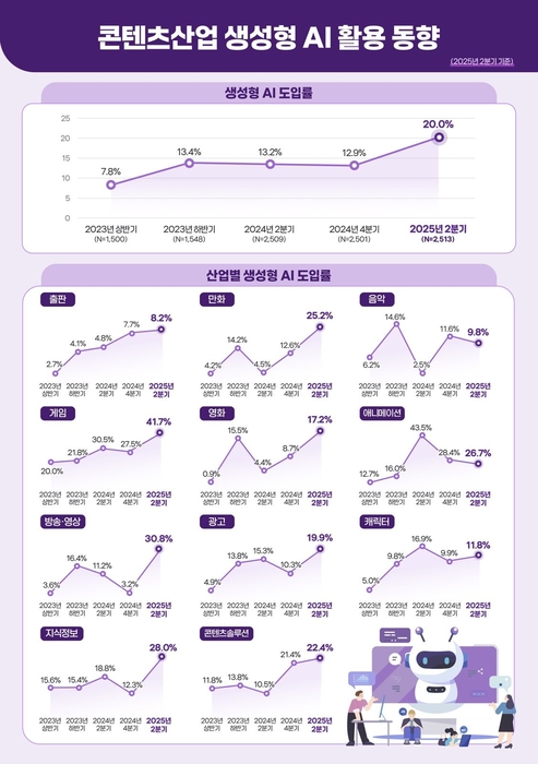 한국콘텐츠진흥원은 전국 콘텐츠 사업체 2513곳을 조사한 결과, 2025년 상반기 생성형 AI 활용률은 20.0%로, 2024년 하반기 대비 7.1%p 상승했다고 1일 밝혔다.