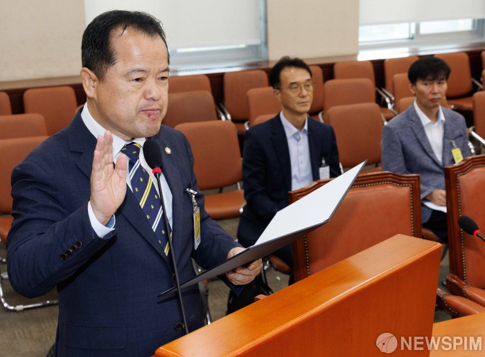 [서울=뉴스핌] 윤창빈 기자 = 위철환 중앙선거관리위원회 위원 후보자가 1일 오전 서울 여의도 국회 행정안전위원회에서 열린 인사청문회에서 선서를 하고 있다. 2025.10.01 pangbin@newspim.com |