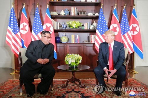 지난 2018년 6월 12일 싱가포르에서 열린 북미정상회담. 2018.9.25 [조선중앙통신=연합뉴스 자료사진] [국내에서만 사용가능. 재배포 금지. For Use Only in the Republic of Korea. No Redistribution] photo@yna.co.kr |