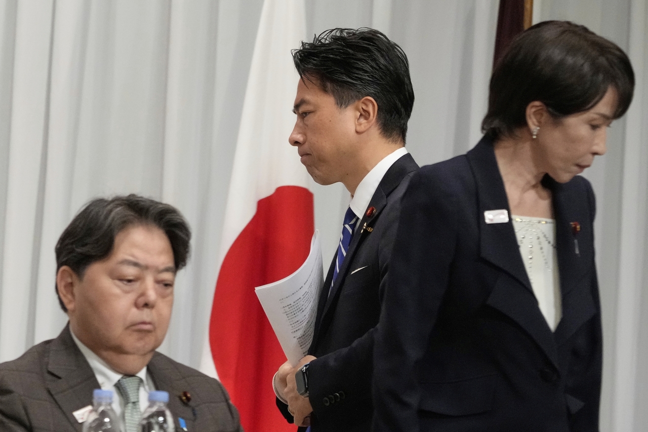 일본의 하야시 요시마사 관방장관(왼쪽), 다카이치 사나에 전 경제안보상(오른쪽), 고이즈미 신지로 농림수산상이 지난 23일(현지시간) 일본 도쿄 자민당 본부에서 열린 자민당 총재 선거 후보자 합동 기자회견에 참석하고 있다. [AP] |