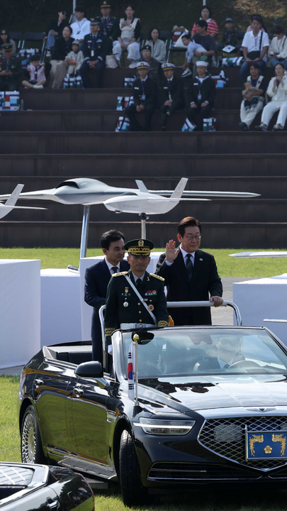이재명 대통령이 1일 충남 계룡대에서 열린 제77주년 국군의 날 행사에서 열병식 사열을 하고 있다. 등 뒤로 유무인 복합 무기쳬계가 보인다. 대통령실사진기자단 |
