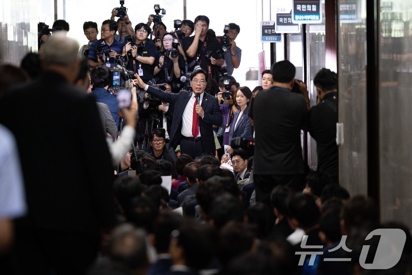 송언석 국민의힘 원내대표가 지난달 3일 서울 여의도 국회 국민의힘 원내대표실 앞에서 열린 긴급 의원총회에서 원내대표실 압수수색을 시도한 내란특검을 규탄하고 있다./뉴스1 ⓒ News1 유승관 기자 |