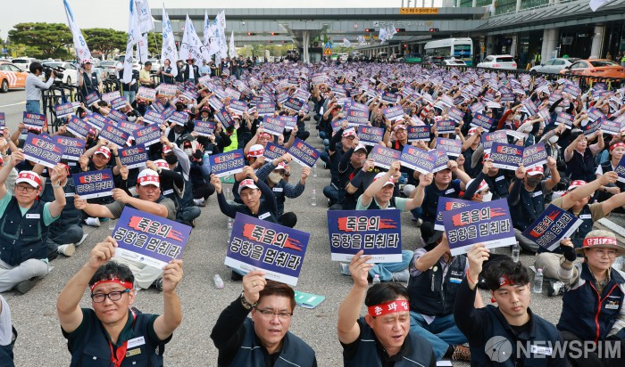 [서울=뉴스핌] 김학선 기자 = 민주노총 공공운수노조 인천공항지역지부와 전국공항노조 조합원들이 1일 서울 강서구 김포공항 국내선 청사 앞에서 '죽음의 공항을 멈춰라!' 총파업대회를 열고 있다. 2025.10.01 yooksa@newspim.com