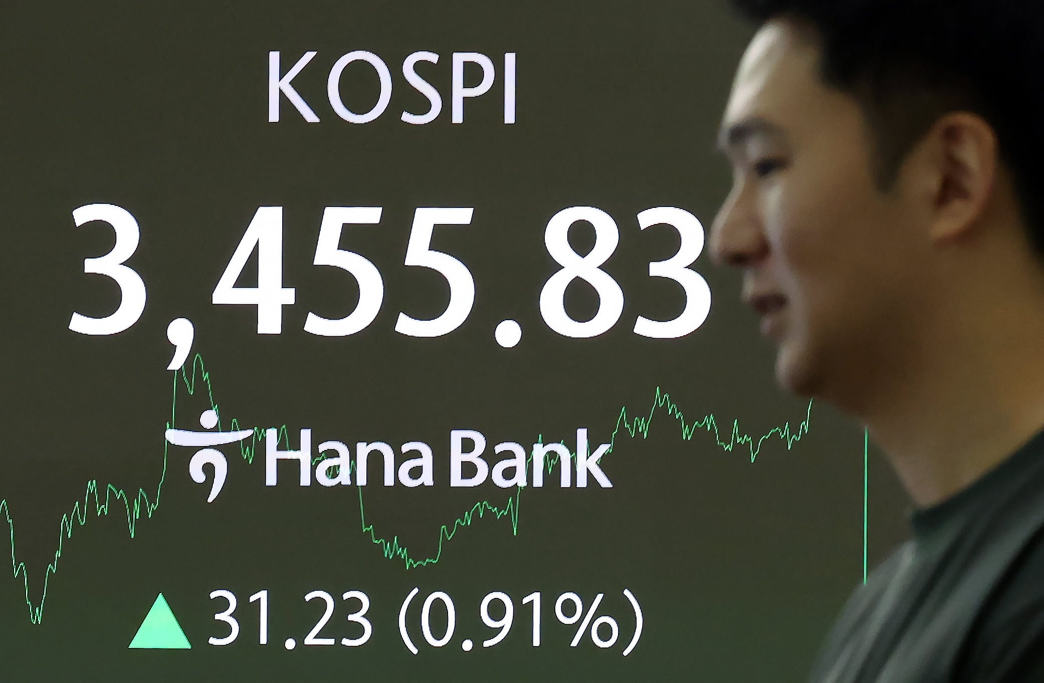 이날 코스피 지수는 전날보다 31.23포인트(0.91%) 오른 3455.83으로 장을 마쳤다. 코스피 지수는 전장보다 19.46포인트(0.57%) 상승한 3444.06으로 개장했다. 개인이 1조853억원어치를 팔아치웠지만, 외국인 투자자와 기관의 매수세가 몰리며 오후 들어 지수는 상승폭을 키웠다. 외국인과 기관은 각각 8459억원, 2200억원어치를 순매수했다.