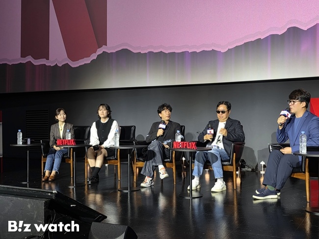 넷플릭스가 1일 미디어 간담회를 열고 배리어 프리 사례집을 공개했다. 사진 왼쪽부터 루시 황 넷플릭스 더빙 타이틀 매니저, 최수연 넷플릭스 시니어 로컬라이제이션 프로듀서, 개그맨 김경식 씨, 이동우 씨./사진=김동훈 기자 |