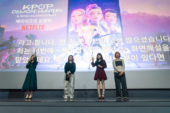 1일 오전 롯데시네마 건대입구에서 열린 넷플릭스 배리어프리 상영회에서 '케이팝 데몬 헌터스' 화면해설 성우 오로아(왼쪽부터)와 '헌트릭스'의 한국어 더빙 성우진 신나리(루미), 김예림(조이), 김도영(미라)가 인사말을 전하고 있다. 넷플릭스 제공 |
