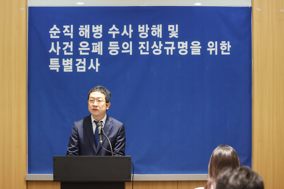 채 상병 사건 외압 의혹을 수사하는 이명현 특별검사팀 정민영 특검보가 지난 달 24일 오전 서울 서초구 특검 사무실 브리핑룸에서 언론 브리핑을 하고 있다. 최현수 기자 emd@hani.co.kr |