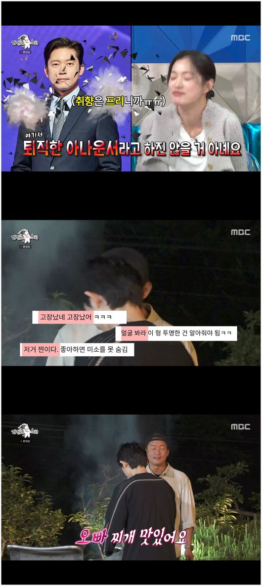 장도연은 “이제 예능에서 러브 라인이 생겼다는데”라며 물었다. 옥자연은 “코드 쿤스트랑 김대호랑 자연 탐방을 하는 코너로 나왔다. 그런데 김대호랑 핑크빛 기류가 있다, 기사가 떴다”라고 말했다. 봉태규는 “둘이 진짜 뭐가 있어 보이던데”라며 거들었다.
