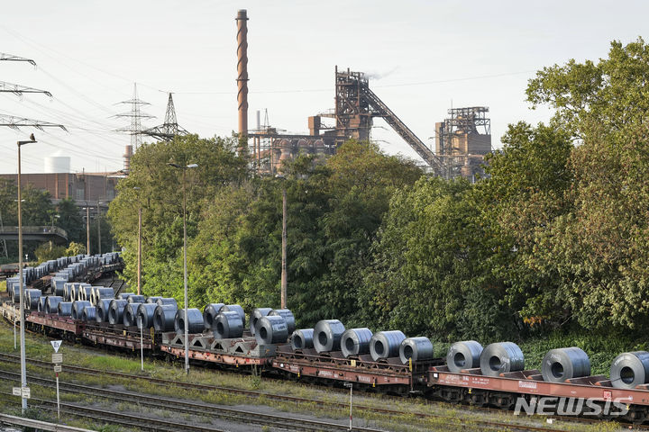 [뒤스부르크=AP/뉴시스] 유럽연합(EU)이 외국산 철강에 대한 관세를 현행 25%에서 50%로 인상하는 방안을 추진 중이라고 1일(현지 시간) AFP가 보도했다. 사진은 2023년 10월 11일 독일 뒤스부르크의 철강 생산업체 티센쿠르푸 스틸 앞에 수송을 기다리는 강철 코일들이 열차에 실린 모습. 2025.10.01. |