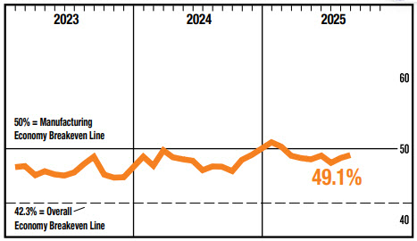 ISM 지수 0.4p 오른 49.1…신규주문지수 2.5p 내린 48.9