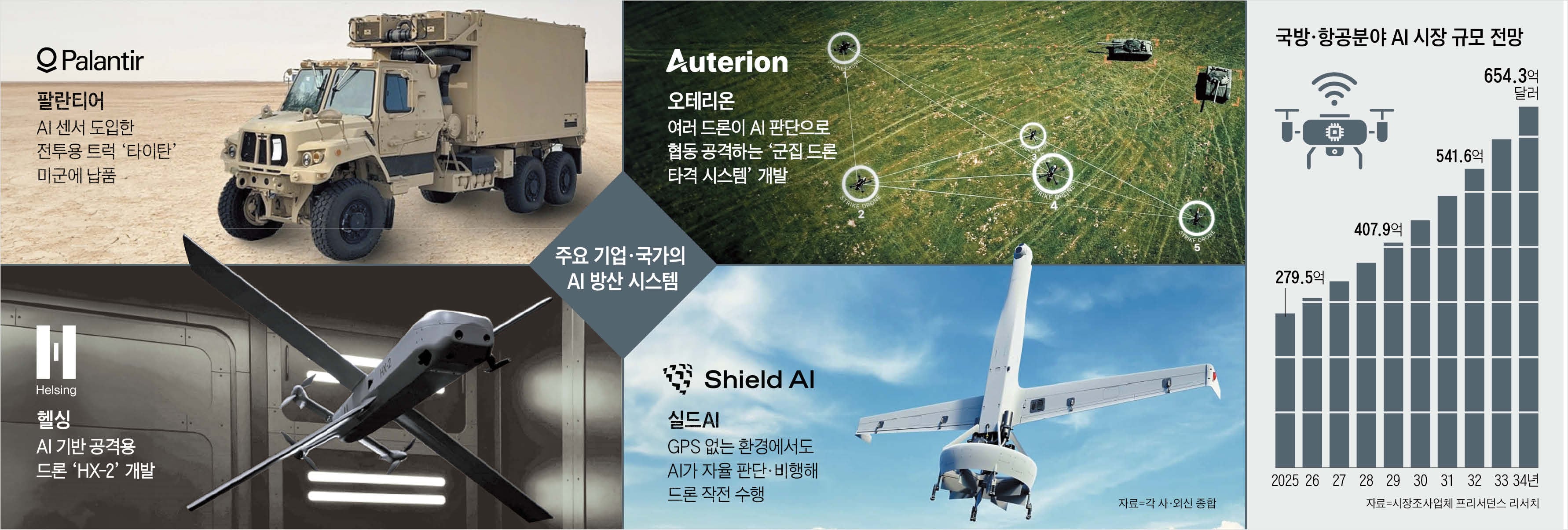 최첨단 기술이 가장 먼저 적용되는 ‘디펜스 테크’(방산·항공 분야 첨단 기술) 중에서도 AI 분야 시장은 눈에 띄게 성장하고 있다. 시장조사 업체 프리시던스 리서치에 따르면 올해 279억5000만달러였던 시장 규모는 내년 307억2000만달러, 2027년 337억7000만달러로 성장하고 2034년엔 654억3000만달러에 이를 것으로 전망된다. 10년 새 134% 증가하는 것이다.