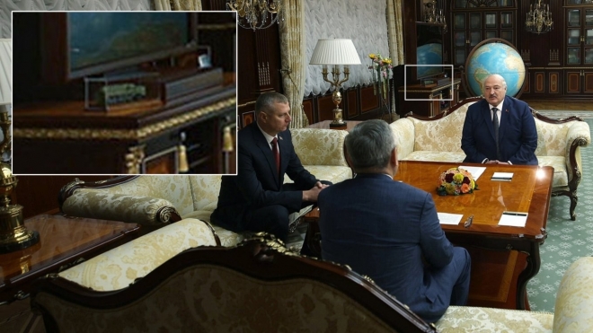 벨라루스 알렉산드르 루카셴코 대통령(사진 맨 오른쪽)의 뒤쪽 책상 위에 오레시니크로 추정되는 축소 모형이 보인다. |