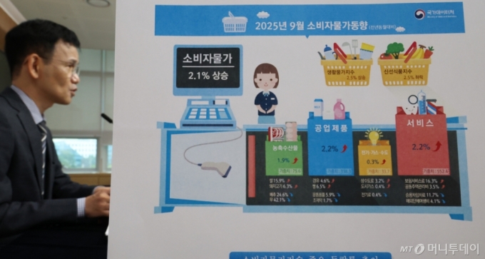 [세종=뉴시스] 강종민 기자 = 이두원 국가데이터처 경제동향통계심의관이 2일 세종시 정부세종청사에서 2025년 9월 소비자물가동향을 발표하고 있다. 지난달 소비자물가지수는 117.06(2020=100)로 전년 동월 대비 2.1% 상승한 것으로 나타났다. 2025.10.02. |