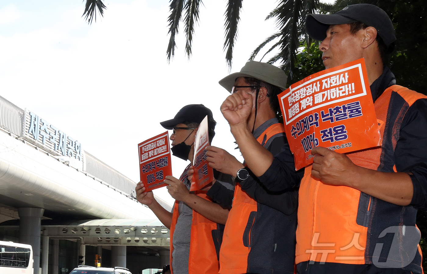 (제주=뉴스1) 오미란 기자 = 공공연대노동조합 제주본부 소속 제주국제공항 노동자들이 파업 이틀째인 2일 오전 제주국제공항 앞에서 피켓 시위를 하고 있다. 2025.10.2/뉴스1