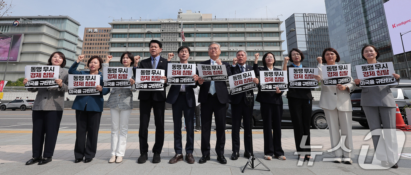 (서울=뉴스1) 김성진 기자 = 서왕진 조국혁신당 원내대표를 비롯한 더불어민주당·조국혁신당·진보당 의원들이 2일 서울 종로구 주한미국대사관 앞에서 열린 미국의 부당한 대미투자 요구 철회 촉구 기자회견에서 구호를 외치고 있다. 2025.10.2/뉴스1