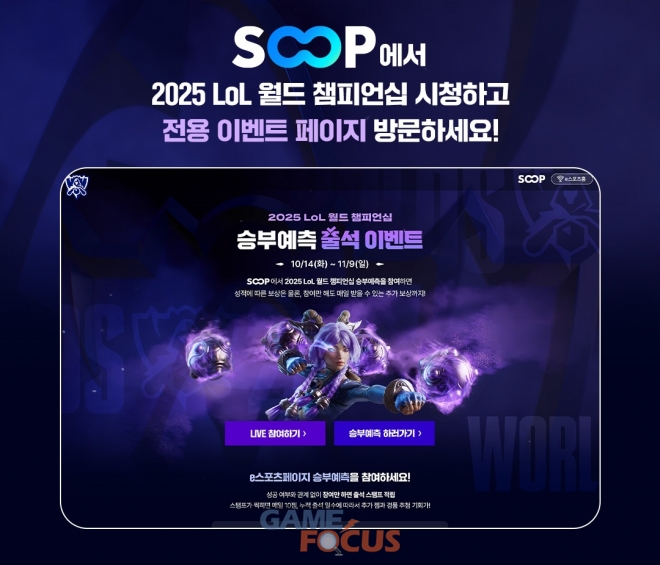 SOOP은 2일(목) 오후 2시부터 ‘2025 LoL 월드 챔피언십(이하 월즈 2025) 이벤트 페이지를 운영하며, 대회 기간 동안 유저들이 직접 참여할 수 있는 다양한 프로그램을 선보인다고 밝혔다. 이번 이벤트는 월즈 2025 기간에 맞춰 마련됐으며, 승부예측, 응원 메시지 릴레이, 시청 드롭스 등 다양한 프로그램으로 팬들에게 즐길 거리를 제공한다.