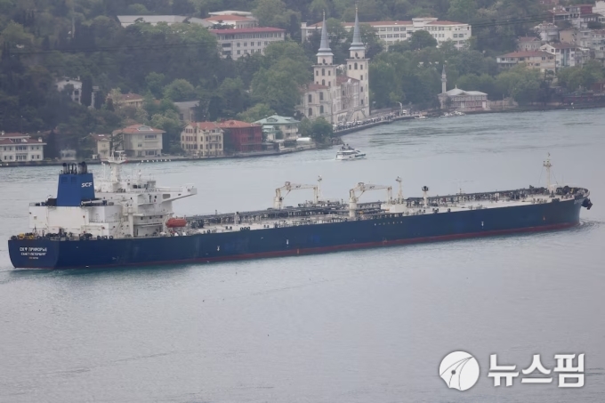 [사진=로이터 뉴스핌] 러시아 국영 해운사 소브콤플로트(Sovcomflot) 소유의 유조선 SCF 프리모리호가 지난 2024년 4월 29일(현지시간) 튀르키예 보스포러스 해협을 통과하고 있다. |
