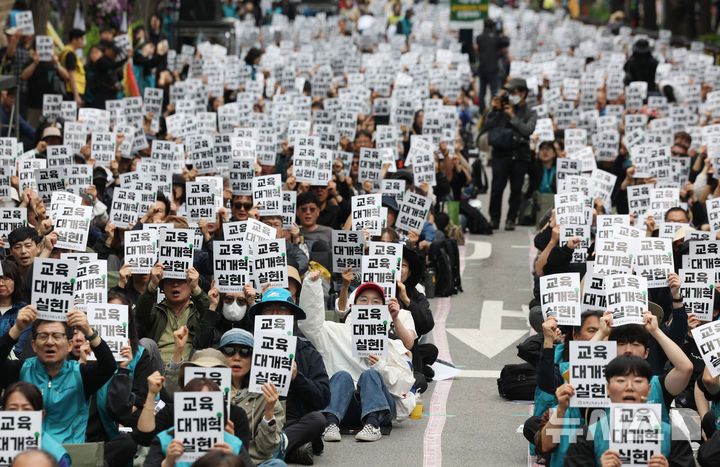 [서울=뉴시스] 김진아 기자 = 24일 서울 종로구 고궁박물관 서측에서 열린 전국교직원노동조합(전교조) 창립 36주년 전국 교사결의대회에서 참가자들이 구호를 외치고 있다. 2025.05.24. bluesoda@newsis.com |