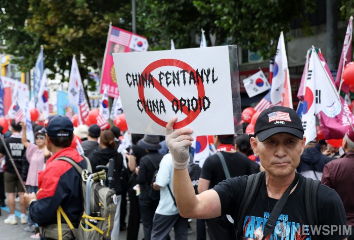 [서울=뉴스핌] 정일구 기자 = 자유대학 등 보수단체 회원들이 3일 오후 서울 종로구 동대문역 인근에서 열린 개천절 반중 집회에서 피켓을 들고 있다. 2025.10.03 mironj19@newspim.com