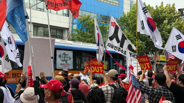 이들은 지난달 29일 시작된 중국인 단체관광객(유커) 무비자 입국 정책에도 강한 반감을 드러냈다. 충북 청주에서 올라왔다는 주은희(67)씨는 "이재명이 무슨 생각으로 중국인을 불러들인 것인지 모르겠다"면서 "중국인은 관광 오는 게 아니다. 불안해 못 살겠다"고 했다. 대학생 전모(22)씨도 "뉴스만 봐도 중국인의 범죄 소식이 끊이질 않는데 (무비자 입국 조치로) 치안이 악화될 게 뻔하다"고 주장했다. 집회 참가자들은 옆 차선을 지나는 버스를 향해 팻말과 태극기를 흔들어보이며 고성을 내지르는 등 과격 행동을 하기도 했다.
