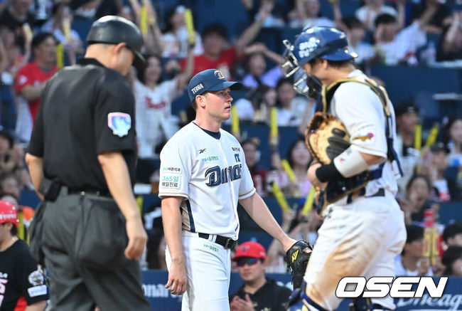[OSEN=창원, 이석우 기자] 6일 창원NC파크에서 2025 신한 SOL 뱅크 KBO 리그 NC 다이노스와 KIA 타이거즈의 경기가 열렸다. 홈팀 NC는 라일리가, 방문팀 KIA는 올러가 선발 출전했다. NC 다이노스 선발투수 라일리가 5회초 무사 1,2루 KIA 타이거즈 김선빈에게 우중간 1타점 안타를 맞고 아쉬워하고 있다. 2025.09.06 / foto0307@osen.co.kr |