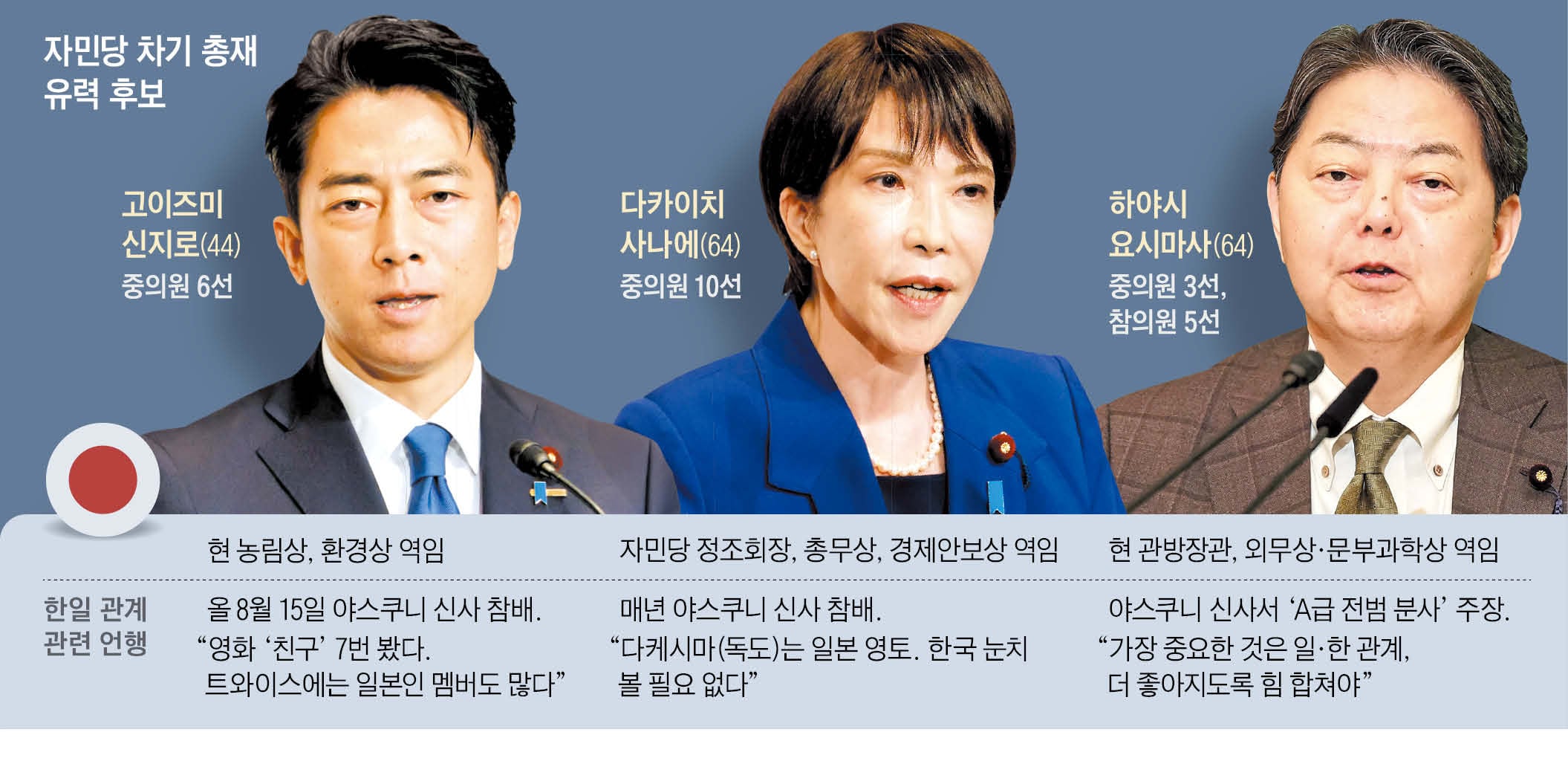 이날 열리는 자민당 총재 선거에선 44세 정치인 고이즈미 신지로 농림상이 앞서가는 가운데 다카이치 사나에(64) 전 경제안보상과 하야시 요시마사(64) 관방장관이 막판 역전을 노리고 있다.