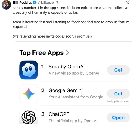 애플 앱스토어 1위 자축하는 오픈AI 소라 팀장 빌 피블스의 글 |