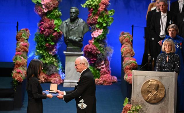 매주 출판 담당 기자의 책상에는 100권이 넘는 신간이 쌓입니다. 표지와 목차, 그리고 본문을 한 장씩 넘기면서 글을 쓴 사람과, 책을 만드는 사람, 그리고 이를 읽는 사람을 생각합니다. 출판 기자가 활자로 연결된 책과 출판의 세계를 격주로 살펴봅니다.한강 작가가 지난해 12월 스웨덴 스톡홀름에서 열린 노벨문학상 시상식에서 스웨덴 칼 구스타프 16세 국왕으로부터 메달과 증서를 수여받고 있다. 스톡홀름=AFP 연합뉴스 |