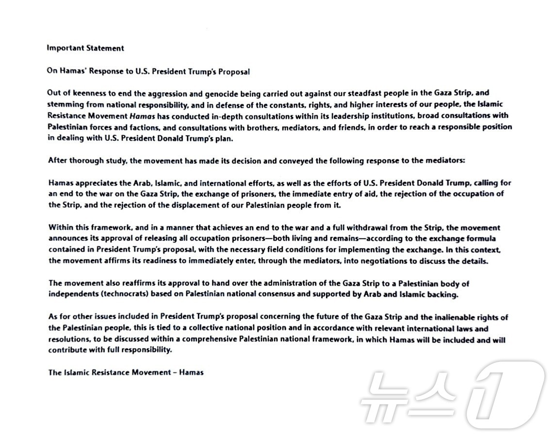 (워싱턴=뉴스1) 류정민 특파원 = 3일(현지시간) 도널드 트럼프 미국 대통령이 소셜미디어 트루스소셜에 게시한 하마스 성명. 자신이 지난달 29일 제안한 가자지구 분쟁 종식안과 관련해 모든 인질석방과 가지지구 행정권력 이양 등 일부를 수용한다는 내용을 담고 있다.(트럼프 트루스소셜, 재판매 및 DB금지) 2025.10.03.