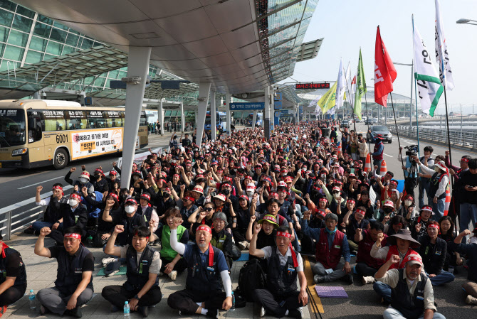 1일부터 무기한 파업에 나선 민주노총 인천공항지역지부 조합원들이 인천공항 제1여객터미널 앞에서 열린 총파업 결의대회에서 구호를 외치고 있다. (사진 = 뉴시스 제공) |