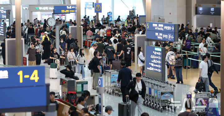 [서울=뉴시스] 김선웅 기자 = 개천절이자 추석 연휴 첫 날인 3일 인천국제공항 출국장에서 여행객들이 출국 수속을 밟고 있다.인천국제공항공사는 올 추석연휴 기간 총 이용객 245만3000명, 하루평균 이용객 22만3000명이 될 것으로 전망했으며 출발 여객이 가장 많은 날은 3일 12만9000명으로 예측했다. 2025.10.03. mangusta@newsis.com |