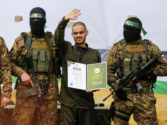 이슬람 무장단체 하마스가 지난 2월 정전에 합의한 이스라엘에 인질을 인도하고 있다. [UPI=연합뉴스] |