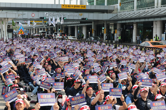 지난 1일 서울 강서구 김포국제공항 국내선 청사 앞에서 열린 전국공항노동자 총파업 대회에서 참석자들이 연속야간노동 근절 위한 교대근무제도 개선 등을 요구하고 있다. 연합뉴스 |