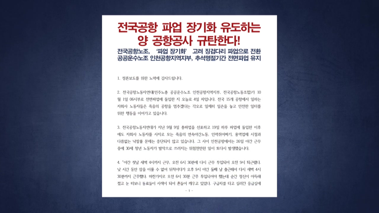 반면 인천국제공항 노동자들은 사측이 노동자들과 대화할 의지가 없다면서, 연휴 기간 계획한 파업을 이어가겠다고 했습니다.