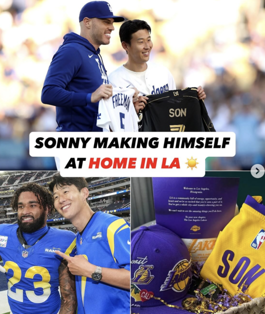 최근 NBA의 최고인기팀 LA 레이커스도 손흥민에게 ‘SON’이 새겨진 커스텀 레이커스 저지를 선물했다. 레이커스는 “웰컴투 LA 쏘니”라는 메시지를 함께 보냈다.