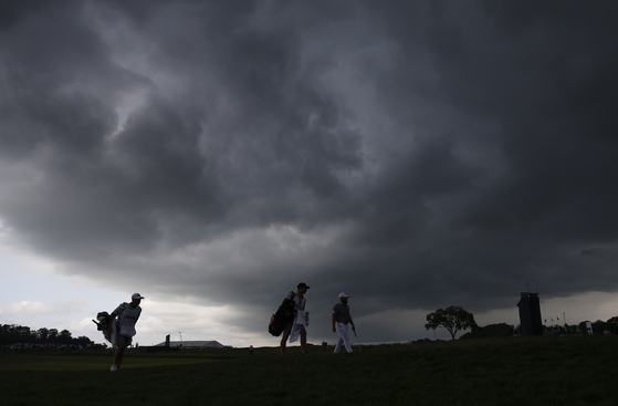 지난 6월 열린 US오픈에서 선수들이 뇌우 때문에 경기가 중단된 코스를 걷고 있다. UPI=연합뉴스 |