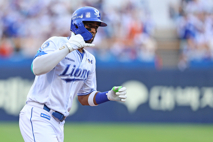 삼성 디아즈가 6일 대구삼성라이온즈파크에서 열린 2025 KBO리그 한화와 경기에서 2회말 좌중월 솔로포를 터뜨린 후 베이스를 돌고 있다. 사진 | 삼성 라이온즈 |