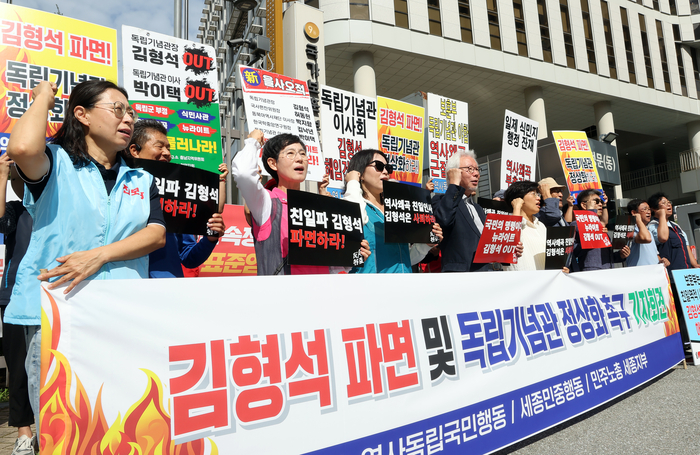역사독립국민행동과 세종지역시민사회단체 회원들이 지난달 23일 정부세종청사 국가보훈부 앞에서 ‘김형석 독립기념관장 파면 및 독립기념관 정상화 촉구’ 기자회견을 열고 있다. [사진 출처 = 연합뉴스] |