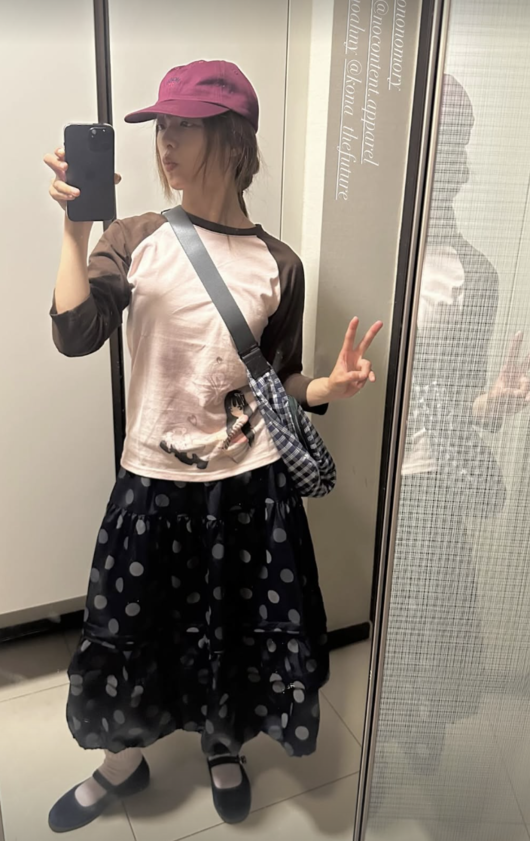 김보라는 6일 집 현관에 있는 전신거울 앞에서 찍은 사진을 공개했다. 사진 속에서 김보라는 긴팔 티셔츠에 스커트, 메리제인 슈즈를 신고 자주색 모자를 착용하고 있는 모습이다.