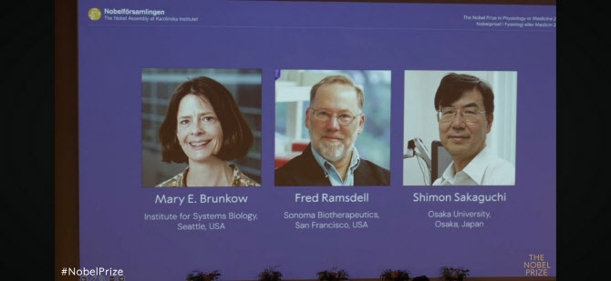 스웨덴 스톡홀름 카롤린스카 연구소 노벨위원회는 6일(현지시간) 메리 E. 브랑코(Mary E. Brunkow 미국 시애틀 시스템생물학연구소 선임 프로그램매니저), 프레드 람스델 (Fred Ramsdell 미국 샌프란시스코 소노마 바이오테라퓨틱스 과학고문), 사카구치 시몬 (Shimon Sakaguchi 일본 오사카 대학 석좌교수)을 올해 노벨 생리의학상 수상자로 선정했다고 발표했다.