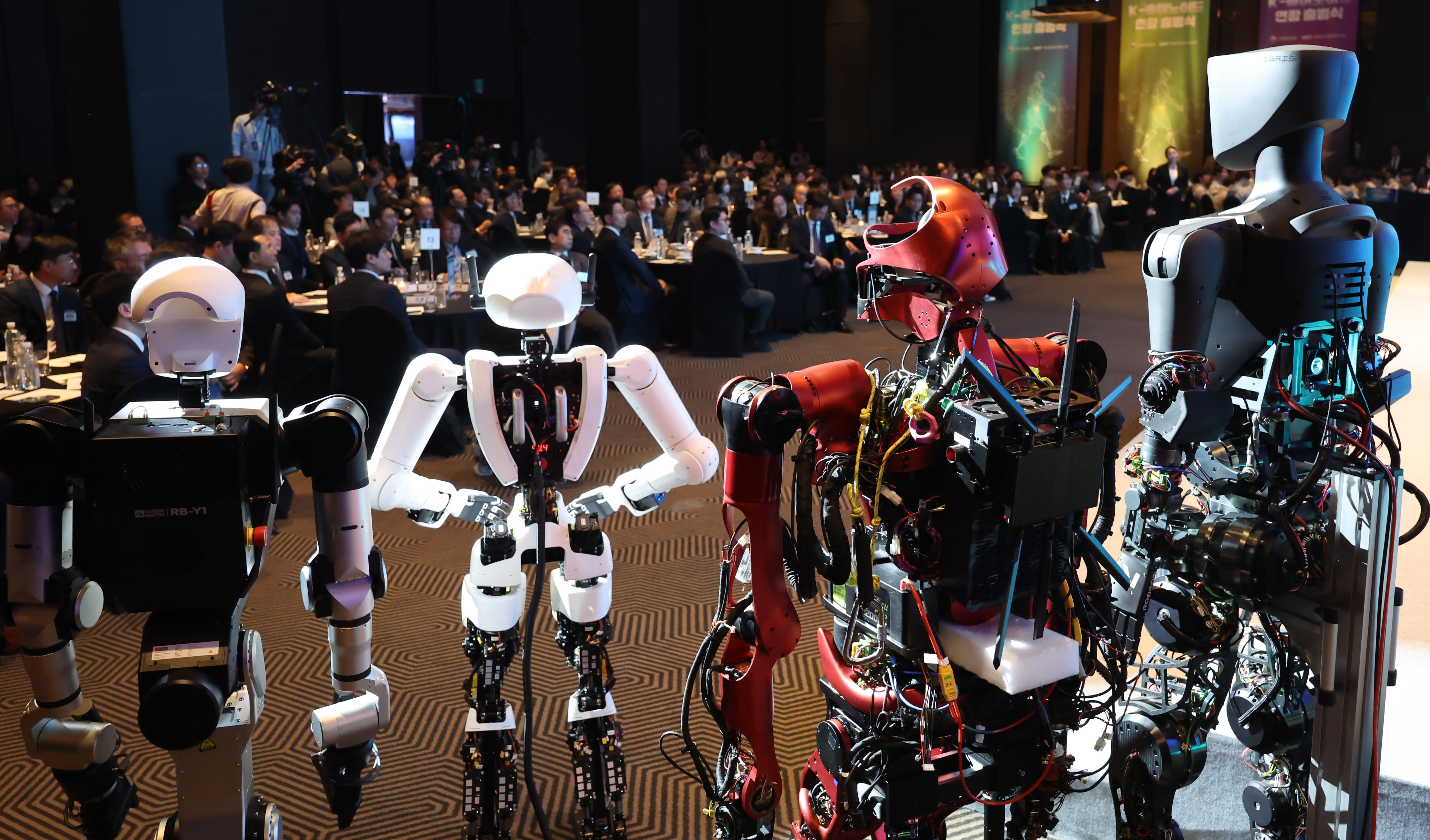 지난 4월 서울 중구 플라자호텔에서 열린 K-휴머노이드 연합 출범식에 전시된 휴머노이드 로봇들./뉴스1 |