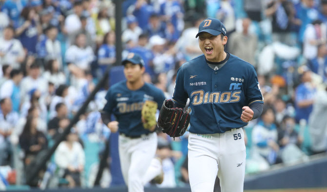6일 대구 삼성라이온즈파크에서 열린 2025 KBO 포스트시즌 와일드카드 1차전 삼성 라이온즈와 NC 다이노스의 경기. NC 선발투수 구창모가 4회말을 무실점으로 마무리하며 환호하고 있다. 사진=연합뉴스 |