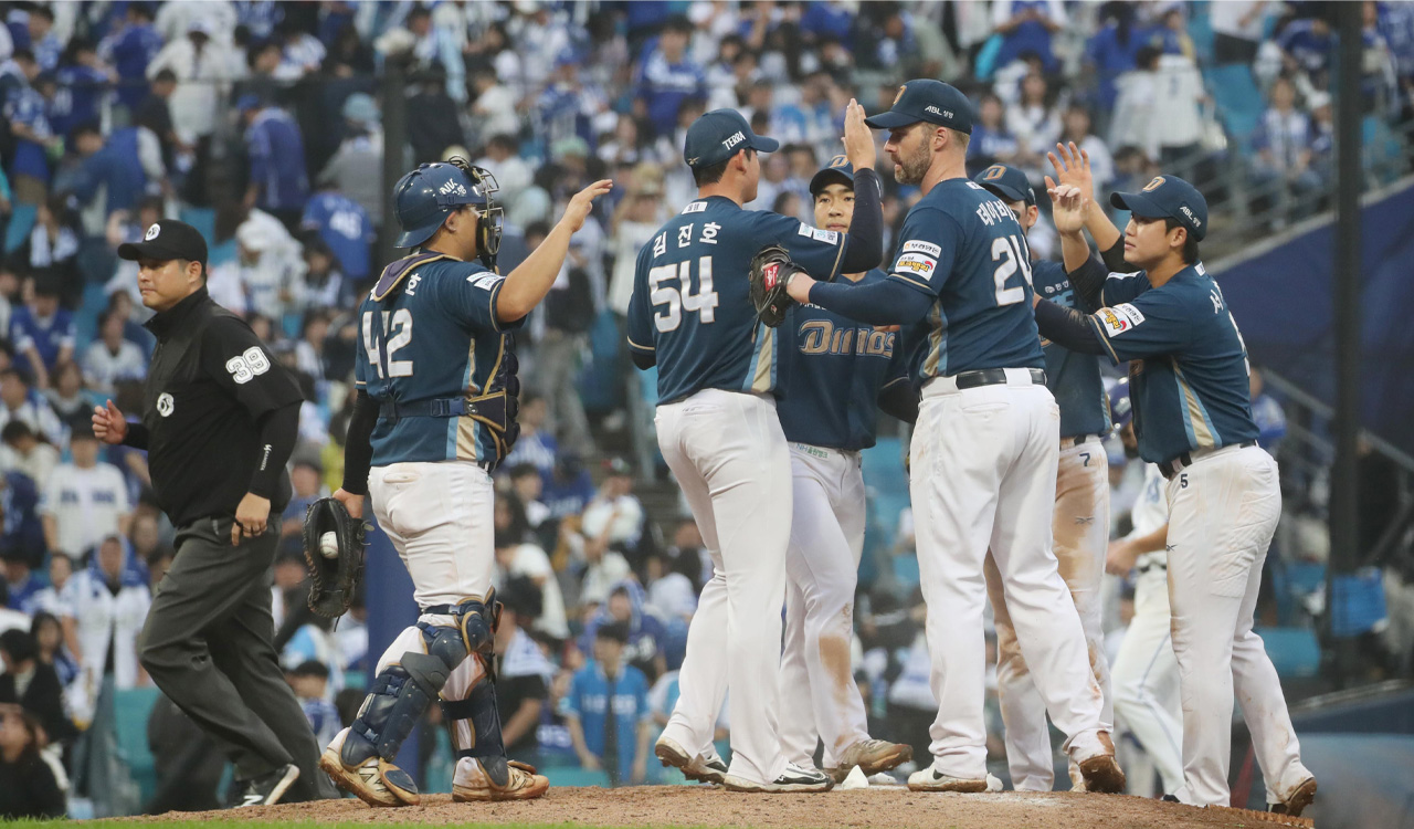 ▲ 6일 대구 삼성라이온즈파크에서 열린 2025 KBO 포스트시즌 와일드카드 1차전 삼성 라이온즈와 NC 다이노스의 경기. NC가 4:1로 승리후 선수들이 기뻐하고 있다.