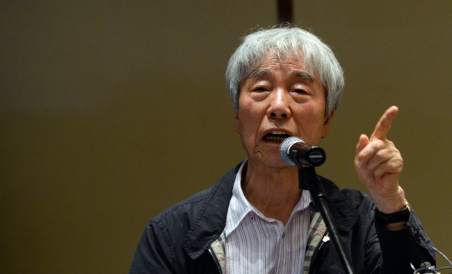 이우환이 2016년 기자회견을 열고 국립과학수사연구소 등이 위작 판정한 작품 13점이 자신의 진품이라고 주장하고 있다. 경향신문 자료사진 |