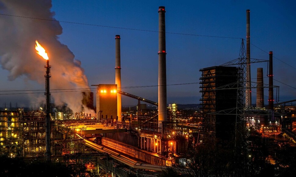 2024년 10월 14일, 독일 서부 뒤스부르크에 위치한 독일 산업 그룹 티센크루프(ThyssenKrupp)의 슈벨게른 용광로 인근 코킹 플랜트에서 증기가 피어오르고 있다. AFP 연합뉴스 |
