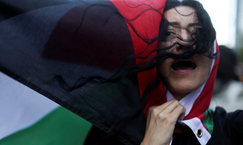 7일(현지시각) 멕시코 수도 멕시코 시티에서 머리에 팔레스타인기를 두른 한 여성이 팔레스타인 지지 집회에 참석하고 있다. 로이터 연합뉴스 |