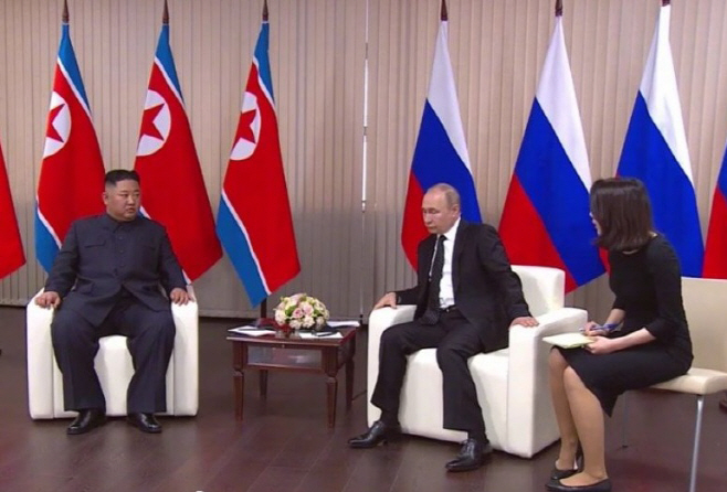 김정은 북한 국무위원장과 블라디미르 푸틴 러시아 대통령. 상호 브로맨스를 자랑하는 사이답게 7일 김 위원장이 푸틴 대통령에게 생일을 축하하는 축전을 보냈다./신화(新華)통신. |