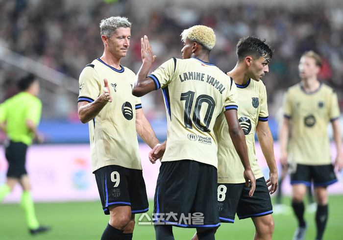 FC바르셀로나의 라민 야말(가운데)이 31일 서울월드컵경기장에서 열린 FC서울과의 친선 경기에서 자신의 두 번째 골을 넣고 레반도프스크아 하이파이브를 하고 있다. 2025. 7. 31. 박진업 기자 upandup@sportsseoul.com |