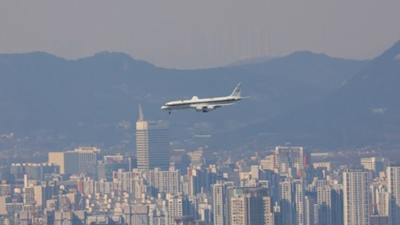 ▲ '아시아 대기질 공동 조사' 일환으로 지난해 2월 26일 대기질 측정 장비가 설치된 미 항공우주국(NASA)의 연구용 DC-8 항공기가 서울 도심 위를 지나고 있다.