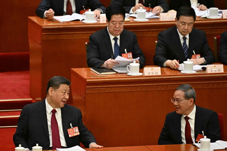 시진핑(사진 왼쪽) 중국 국가주석이 지난 3월5일 전국인민대표대회 개막식에서 리창(사진 오른쪽) 중국 국무원 총리와 이야기를 나누고 있다. 베이징/AFP 연합뉴스 |